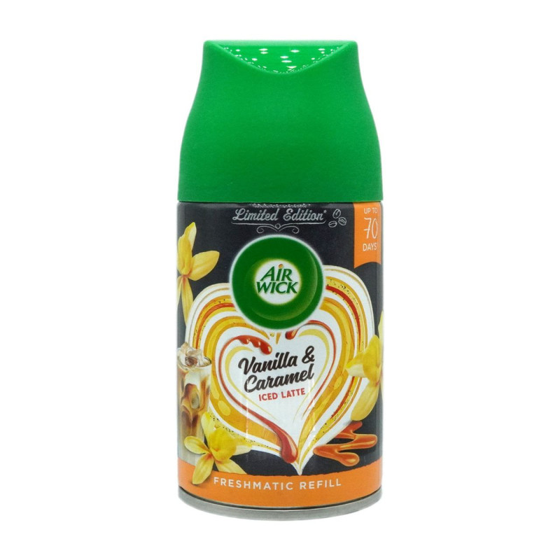 LIMITED EDITION: Air Wick Freshmatic refills in delightful Vanilla & Caramel Iced Latte fragrance, bringing a cosy café atmosphere to your home
